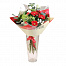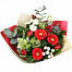 Гербера мини красная, Хризантема кустовая Сантини Мадиба белая, Лизиантус белый, Тюльпан красный, Вибурнум, Хиперикум, Эвкалипт Беби Блю, Салал