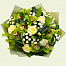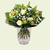 Фрезия белая, Роза Эвеланш 50 см, Орхидея зеленая бутон, Умбрелла, Хризантема кустовая Сантини Мадиба белая, Аспидистра, Салал, Пробирка для орхидей 30 см