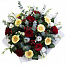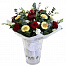 Лизиантус белый, Гербера мини кремовая, Роза микс красная 50 см, Хиперикум, Аспидистра, Эвкалипт Беби Блю, Салал, Фисташка